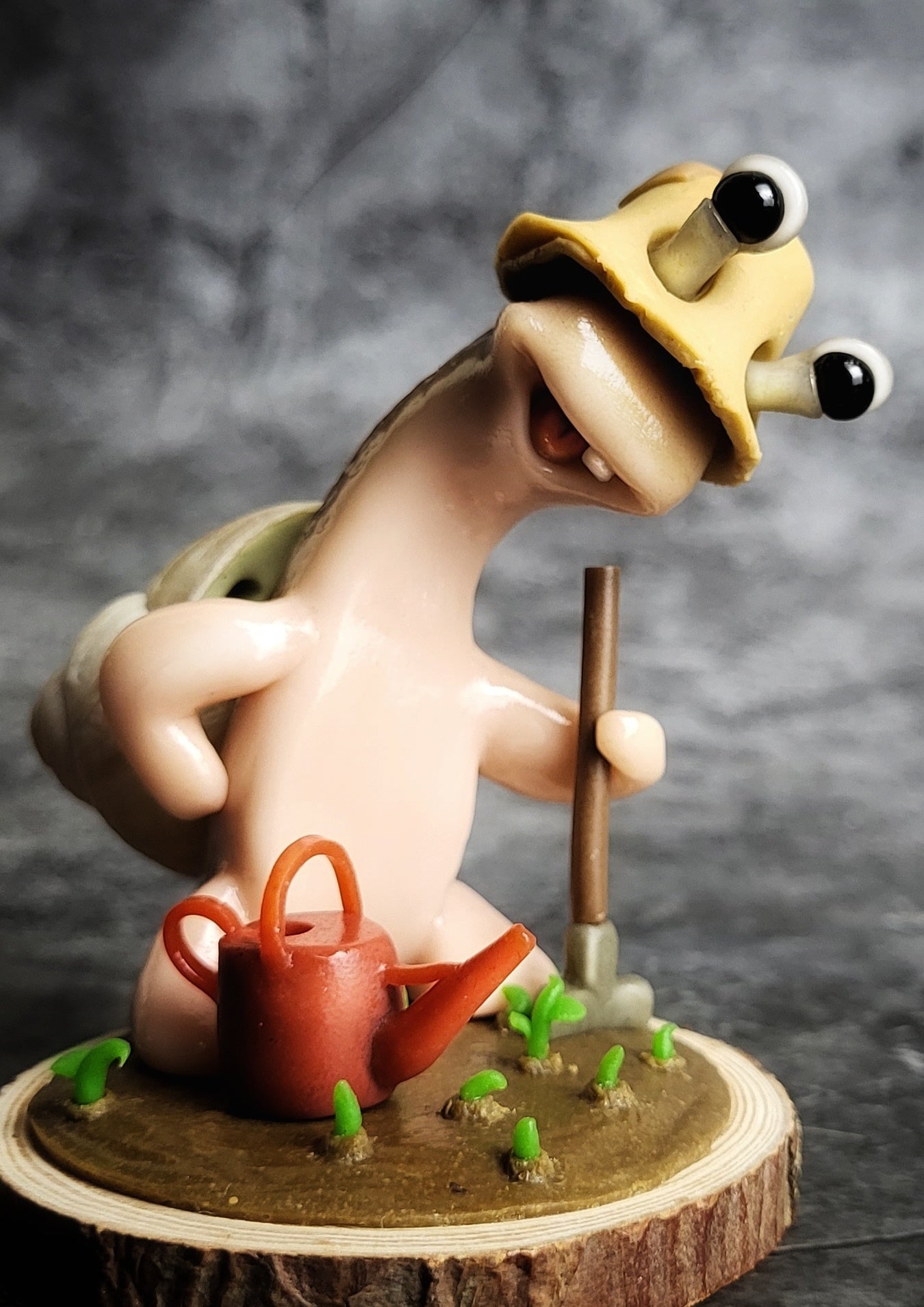 Mulch is a soft-spoken gardener, always tending to his sprouts with a gentle smile that rarely leaves his face. His trusty spade and watering can are his constant companions, helping him nurture every plant with care and precision. With each carefully placed seed and every drop of water, Mulch quietly brings life to the garden, content in the steady rhythm of his work. Though he doesn't seek attention, the vibrant greenery around him is a testament to his dedication, and his smile shows the quiet joy he finds in helping things grow.