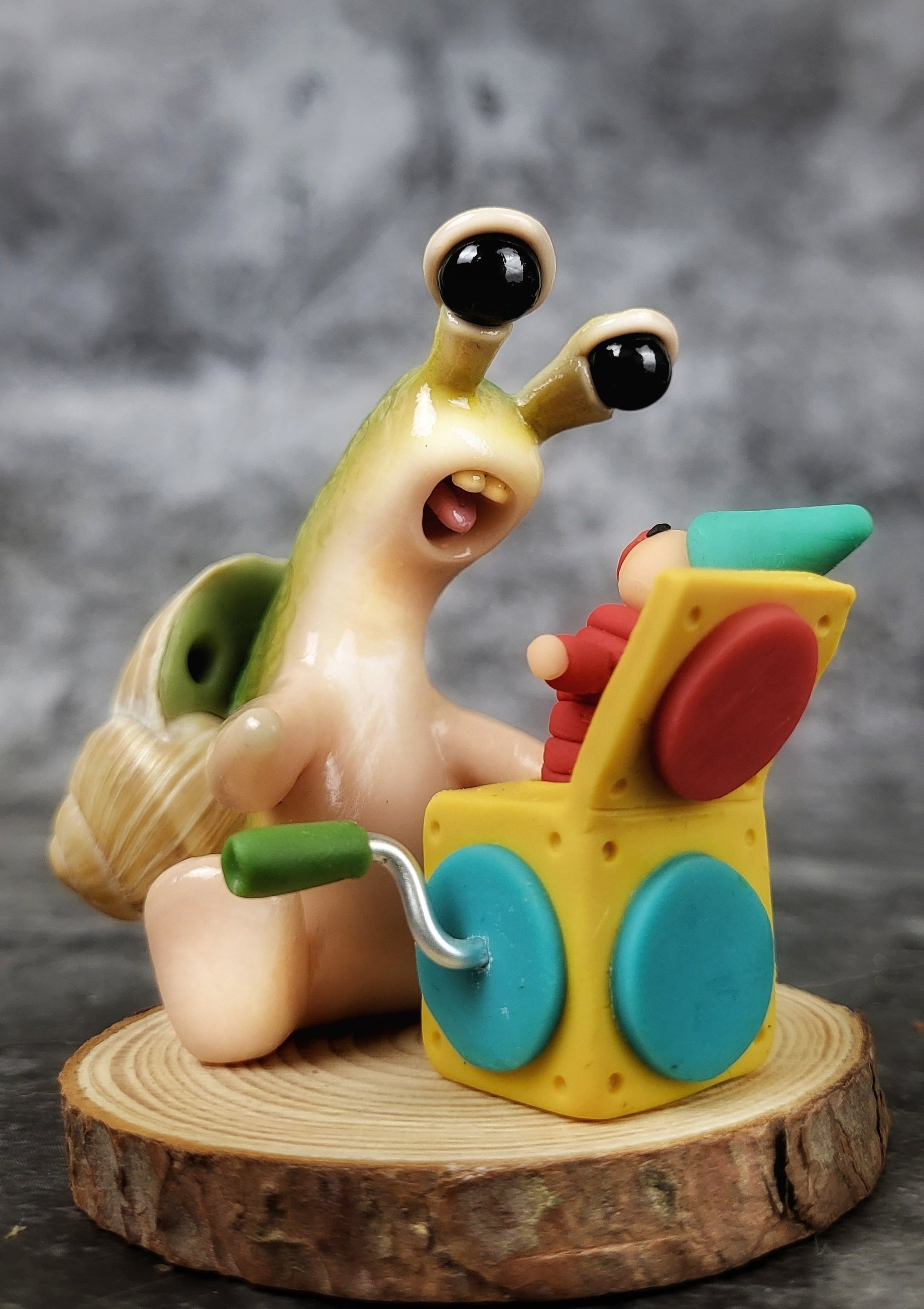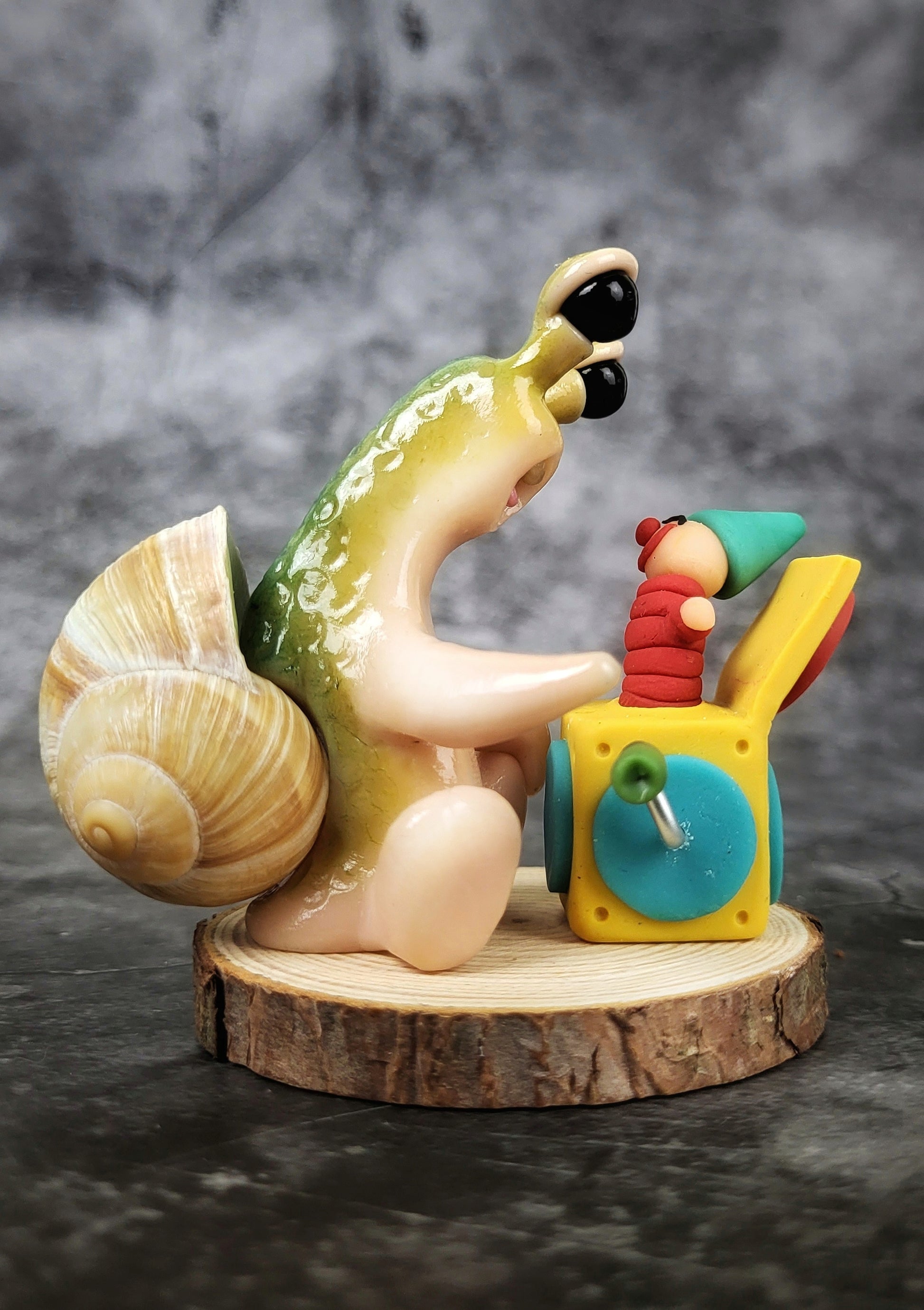 Tibby is a little snail with a heart full of wonder. Each day, he wakes up and scurries over to his favorite toy—a colorful jack-in-the-box tucked in the corner of his burrow. With a careful twist of the handle, Tibby waits, eyes wide and antennae twitching, until pop! Out springs the jester, and Tibby lets out a tiny, high-pitched squeal that echoes through the tunnels. No matter how many times he plays, it never gets old. The other snailz have grown used to his delighted squeaks, a joyful little song that tells them Tibby is awake, ready to bring a bit of brightness to their day.