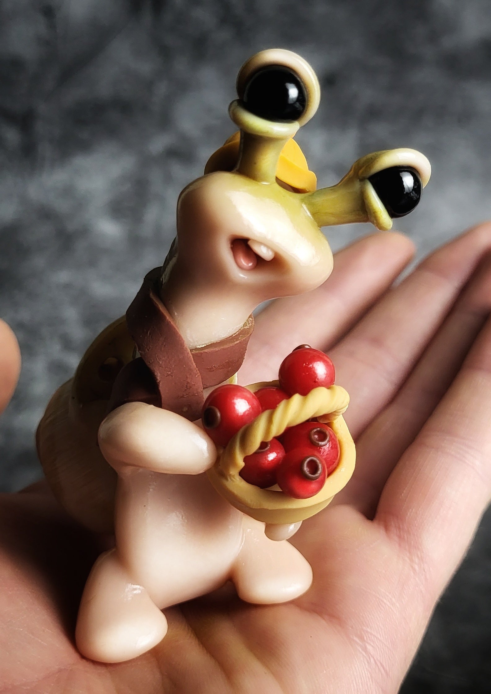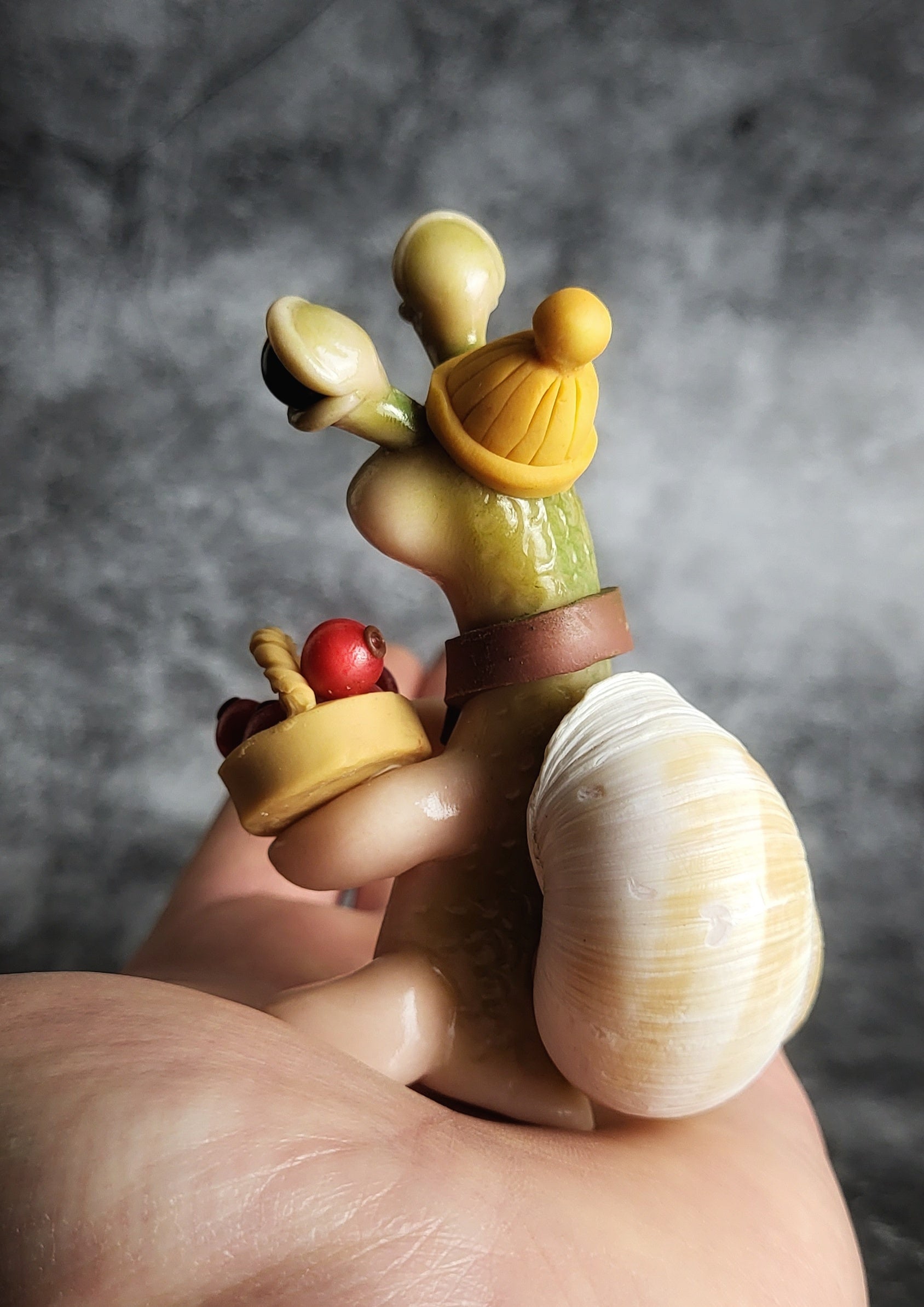 Rustle is a warm-hearted snail, known throughout the colony for his dedication to preparing for the colder months. As soon as the first autumn leaves fall, Rustle can be seen with his trusty woven basket, gathering the freshest berries from the bushes for his mother's famous homemade berry stew. His beanie keeps him warm as he forages, the sound of leaves crunching beneath him as he moves about. Rustle’s greatest joy is delivering his carefully picked berries to his mother’s kitchen, where the sweet aroma of her cooking fills the burrow. He believes that nothing warms the shell like a bowl of her stew, and every fall, he works tirelessly to make sure no one in the colony goes without.